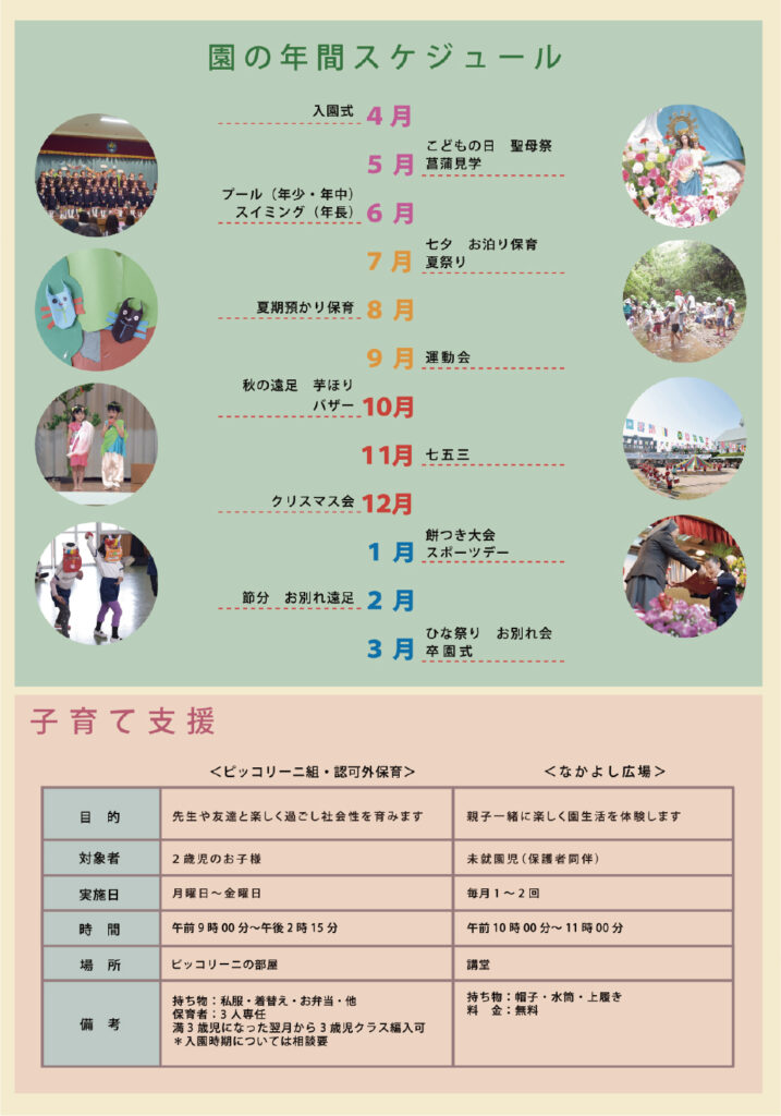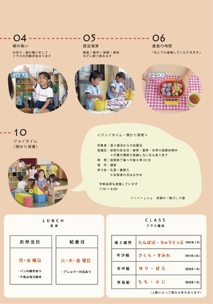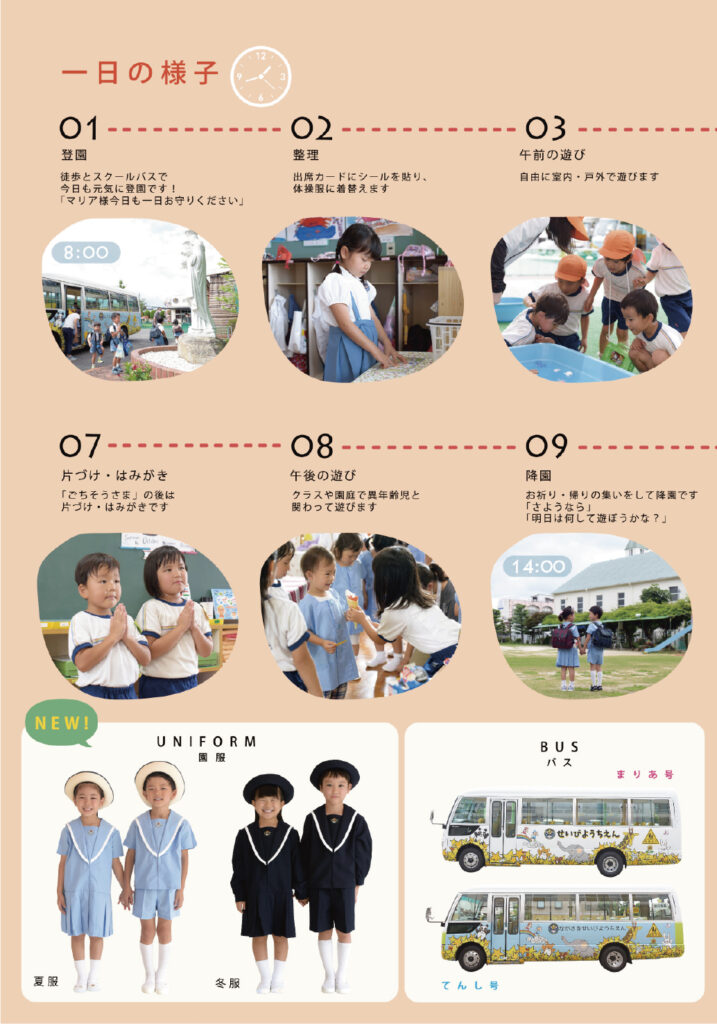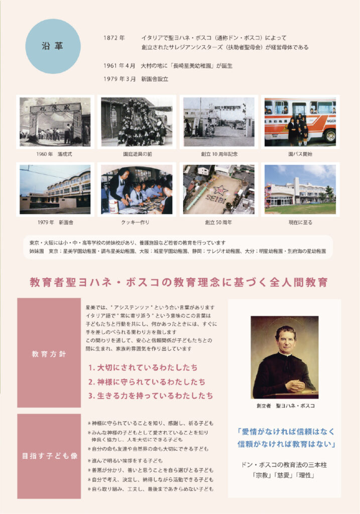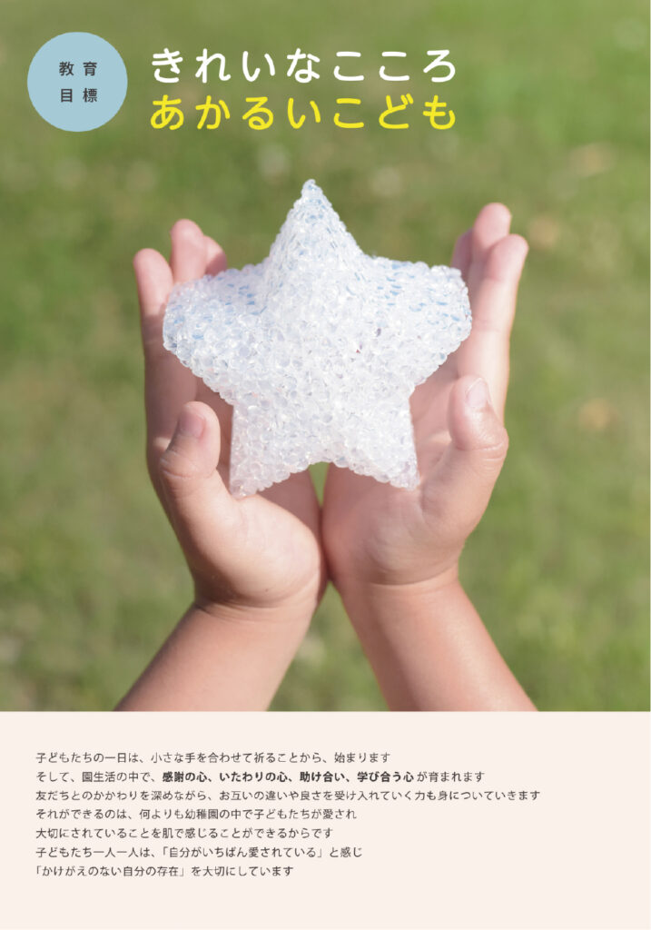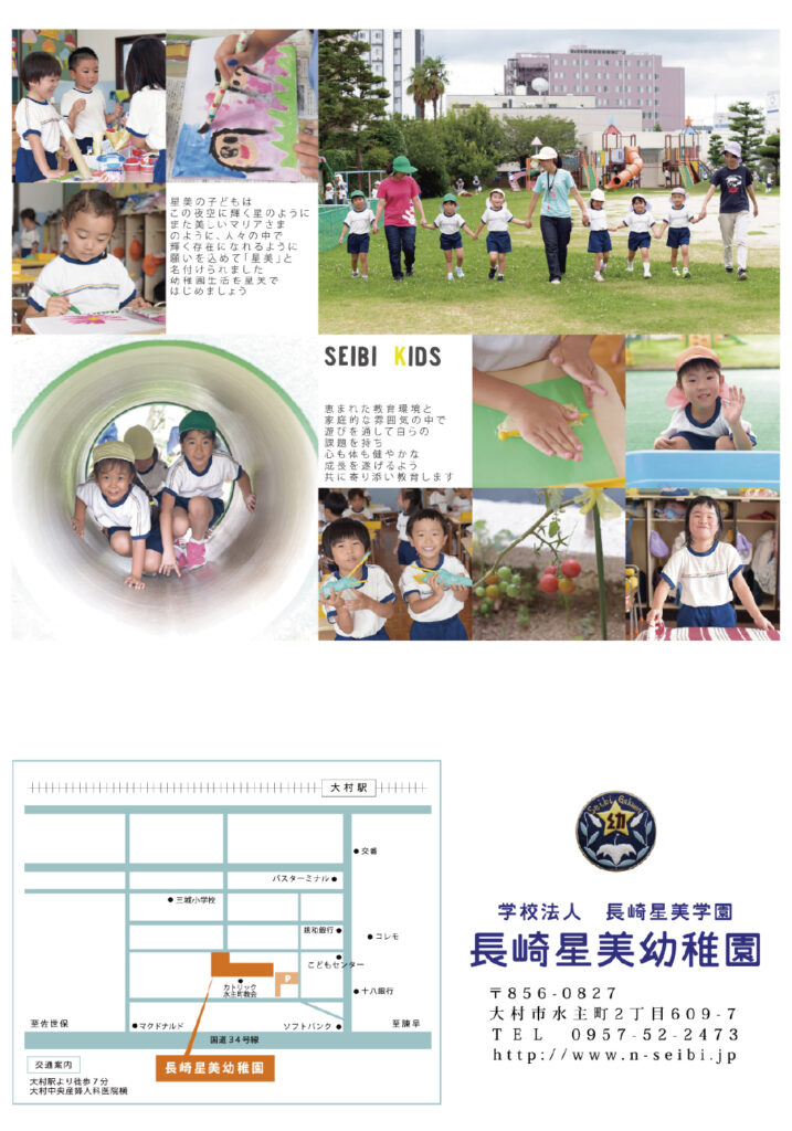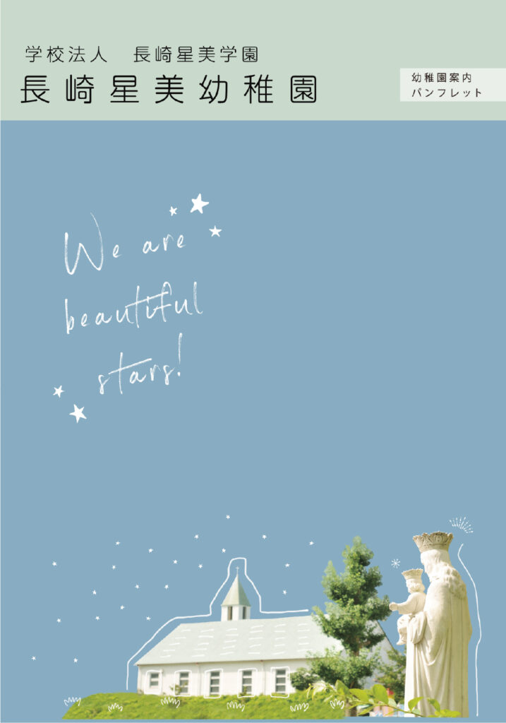 長崎星美幼稚園様の入園案内パンフレットを制作させていただきました。撮影のお仕事をはじめ、日頃より長くご一緒させていただいている信頼関係の中で、園で過ごす子どもたちのキラキラと輝く笑顔を中心に、日々の保育の様子やあたたかな園の雰囲気を大切にデザインしました。はじめての園生活に少し不安を感じる保護者の方にも、『ここなら安心して預けられる』と思っていただけるような、やさしく親しみやすいパンフレットを目指しました。先生方のあたたかなまなざしと、園児たちの生き生きとした表情がつまった一冊です。